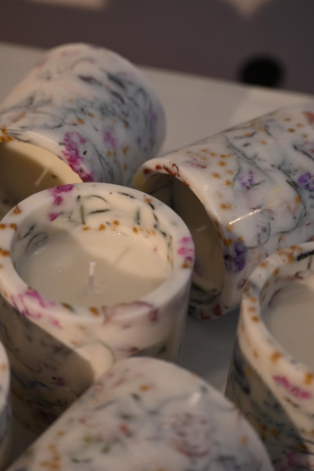 一つ一つのキャンドルに詰められたお花たち、ブレンドされた香りは異なり全てが世界に一つ。